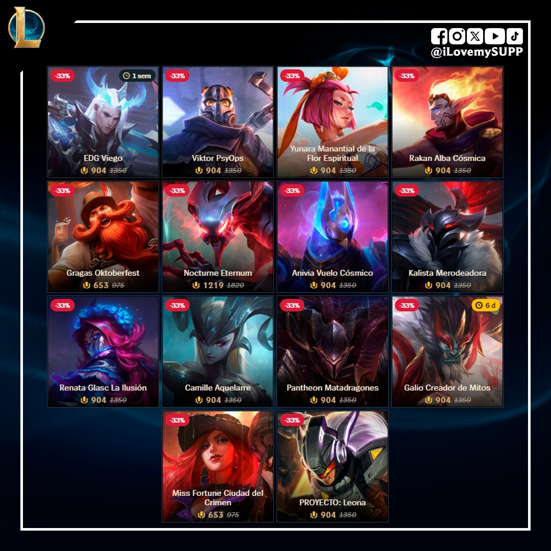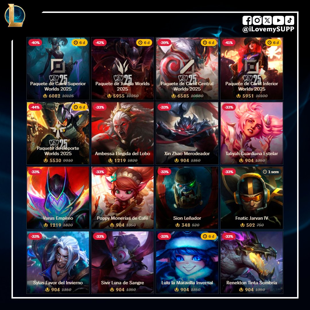 El domingo 9 se celebró la gran final de los Worlds 2025, donde T1 alcanzo la gloria llevándose el trofeo. Los aspectos en descuento para esta semana van a ser todos los usados por los jugadores de T1 durante las 5 partidas de la final, y estarán disponibles hasta el 18 de Noviembre.