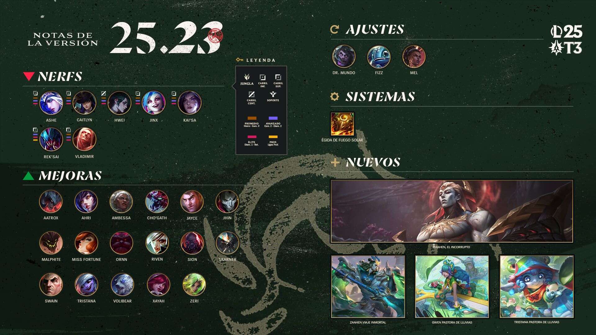 A partir del Miércoles 19 de Noviembre, el parche de la versión 25.23 de League of Legends estará disponible para descargar. Esta versión traerá con ella al nuevo campeón junto a su primera skin, Zaheen Viaje Inmortal, muchos cambios en campeones y objetos, las skins también de Pastores de Lluvia 2024 y, por ultimo pero no menos importante, vuelve URFAR, el emporio de esencia azul y el ¡Mapa Navideño!.