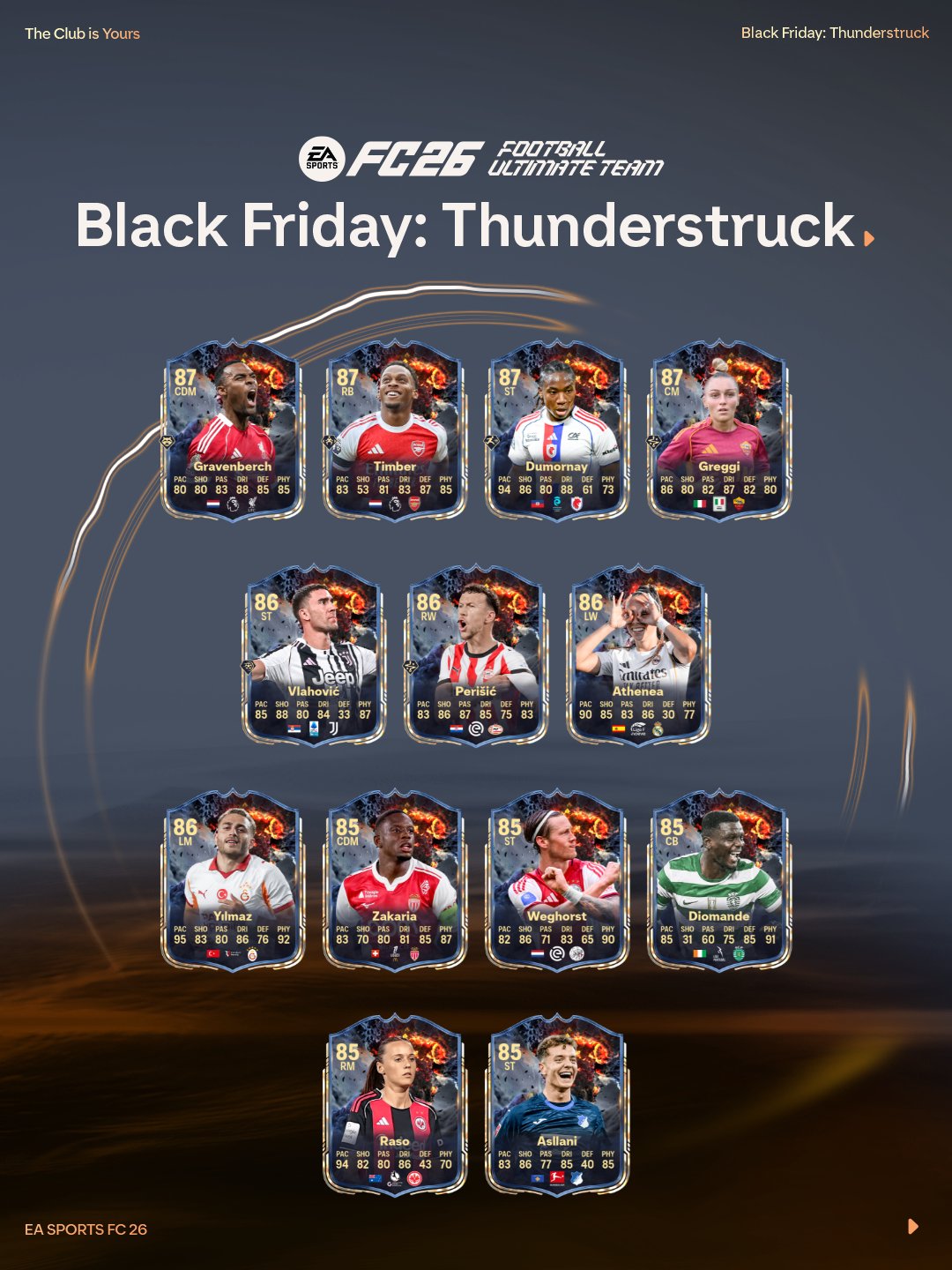Debido al Black Friday, los Thunderstruck llegan a EA FC 26 con cartas que podrán mejorar con el desempeño en vivo de sus jugadores. Algunos de los mejores jugadores son Bellingham, Alexia Putellas y Rodri. Estas cartas estarán disponibles en sobres de la tienda desde el Viernes 28 de Noviembre hasta el Viernes 5 de Didicembre.