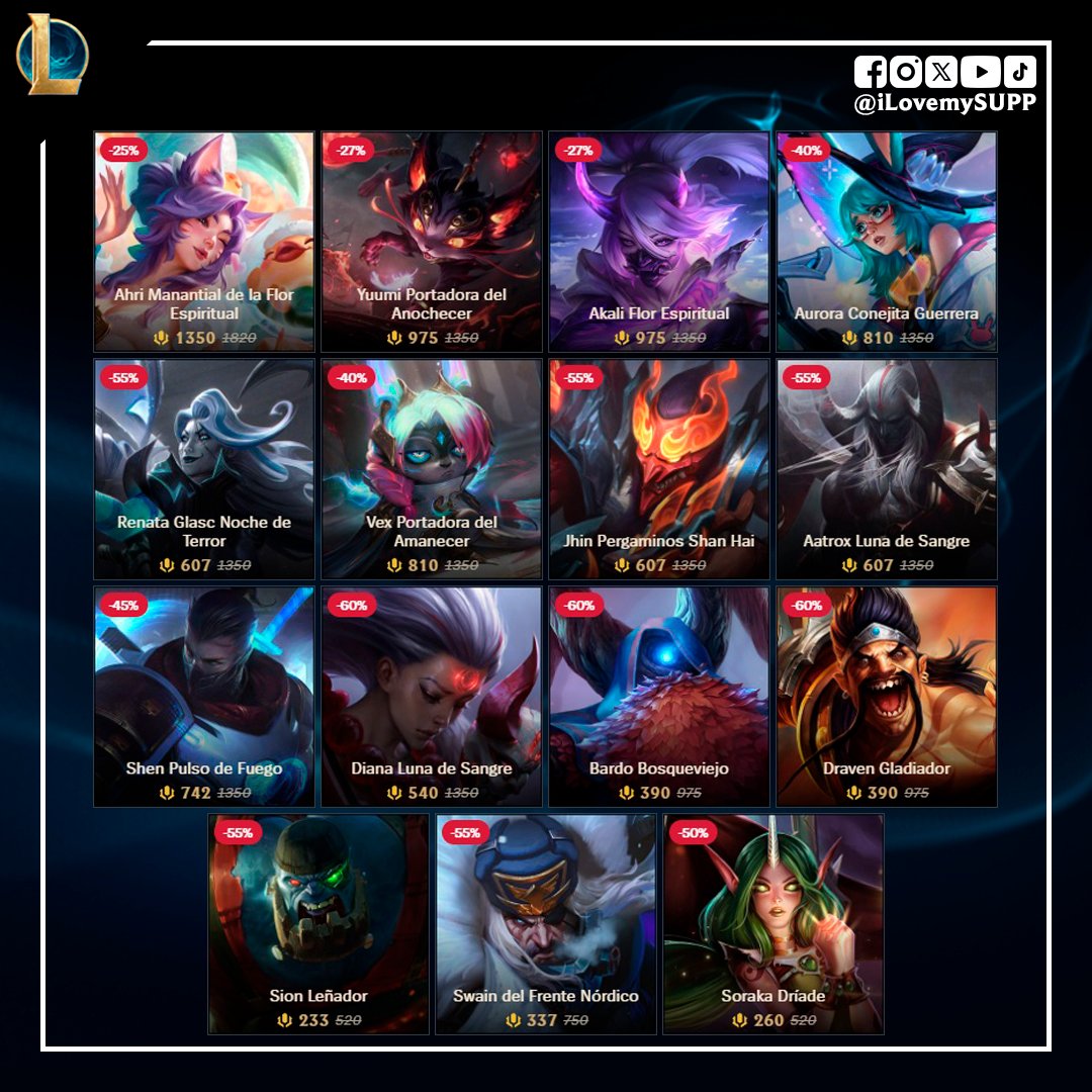 En la ultima semana del año, Riot decide traer un regalo en sus ultimas skins con descuento para esta semana, el cual es una skin legendaria. En esta ocasión, la skin legendaria en descuento es Ahri Manantial de la Flor Espiritual, la cual su precio original es de 1820RP y su precio desde el Lunes 29 de Diciembre hasta el Lunes 5 de Enero será de 1350RP. Esta y muchas ofertas mas estarán disponibles en la tienda de League of Legends.