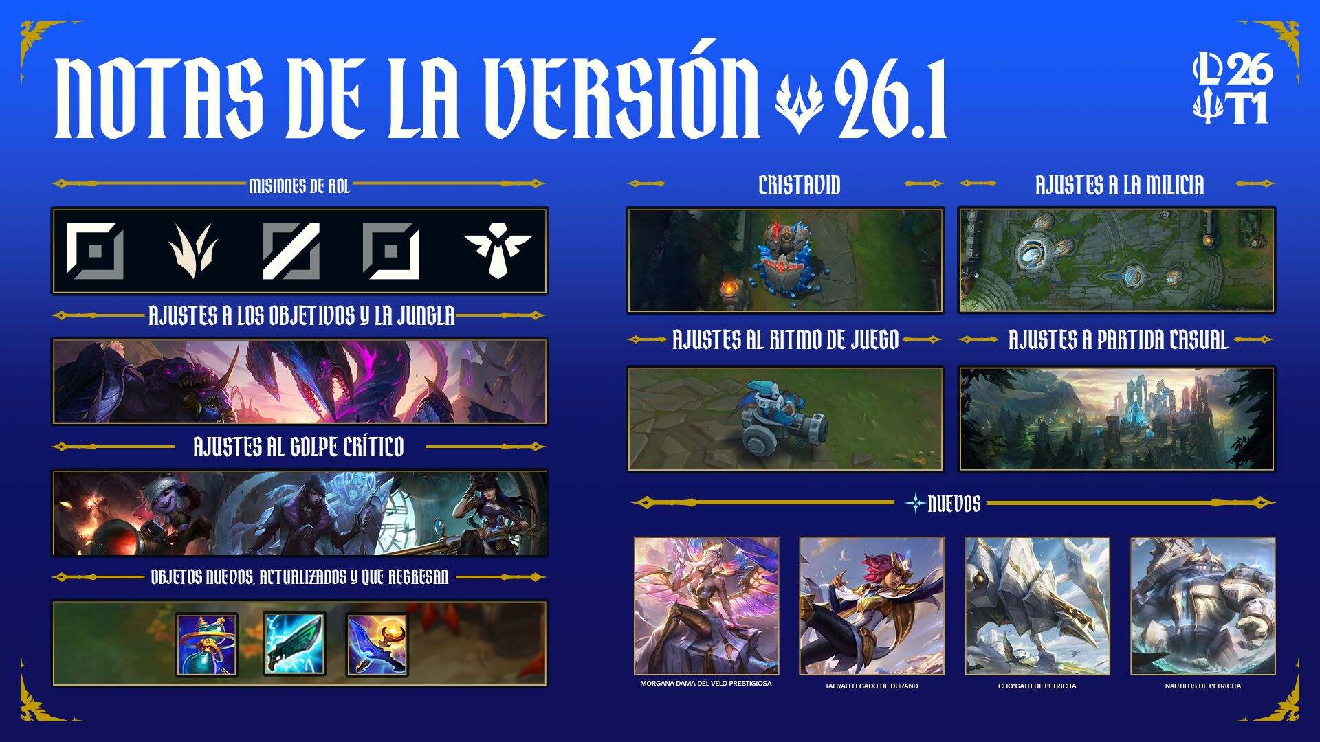 El parche de la actualización 26.1 de League of Legends ya esta aquí y viene muy cargado con muchos cambios incluidos el de la temporada. A partir del Jueves 8 de Enero ya se puede descargar. Esta versión trae el cambio en el mapa(presentando la grieta demaciana), las nuevas e innovadoras misiones de rol, muchos nuevos objetos de itemizacion, un nuevo pase de batalla, las nuevas skins de Demacia(para dicho pase), ajustes a los objetivos de la jungla, ajustes al golpe critico, los nuevos cristales de torre y un gameplay mucho mas rápido en cuanto al inicio.