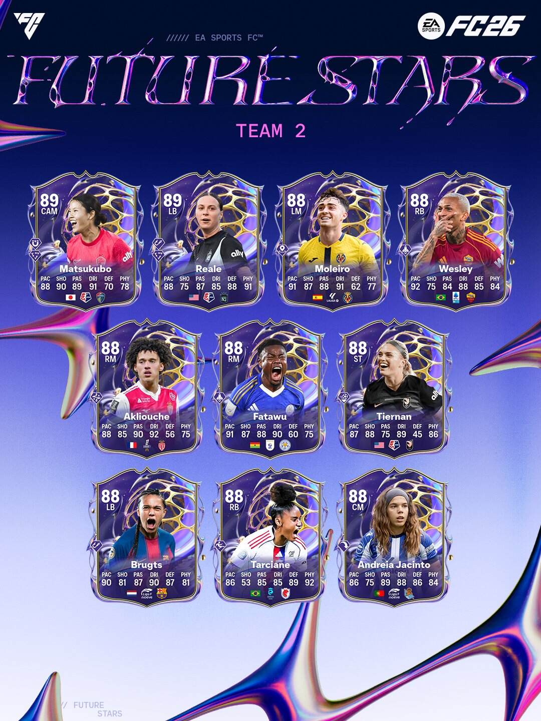 Algunas de las mayores promesas en todo el mundo del futbol fueron elegidas para ser parte del equipo 2 de las futuras estrellas. Además, tenemos a los iconos futuras estrellas y a los héroes futuras estrellas. Todas estas cartas y nuevos objetivos o sbc´s estarán disponibles en el EA FC 26 desde el Viernes 6 de Febrero. Algunos de los mejores jugadores son Karl, Huijsen y Smith.