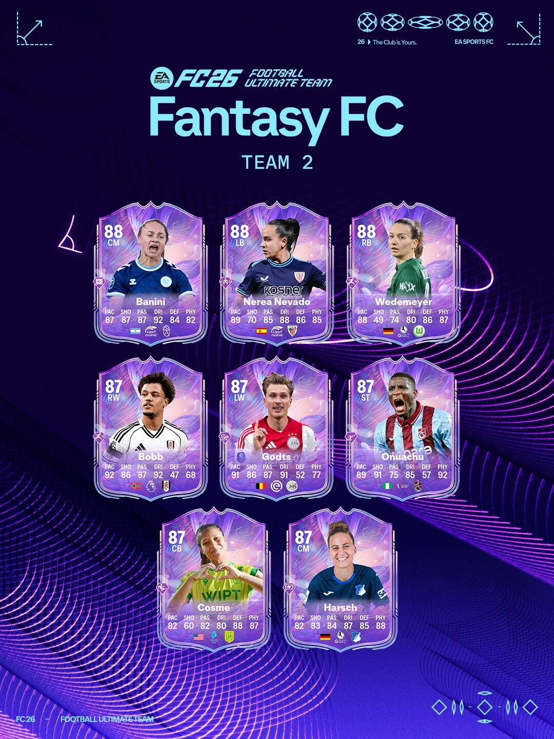 A partir del Viernes 27 de Febrero, el equipo 2 de los Fantasy FC estará disponible en sobres de la tienda de EA FC 26. Cartas con mejoras basadas en los rendimientos de los jugadores en la vida real. Algunos de los mejores jugadores son Wirtz, Guler y Reijnders.