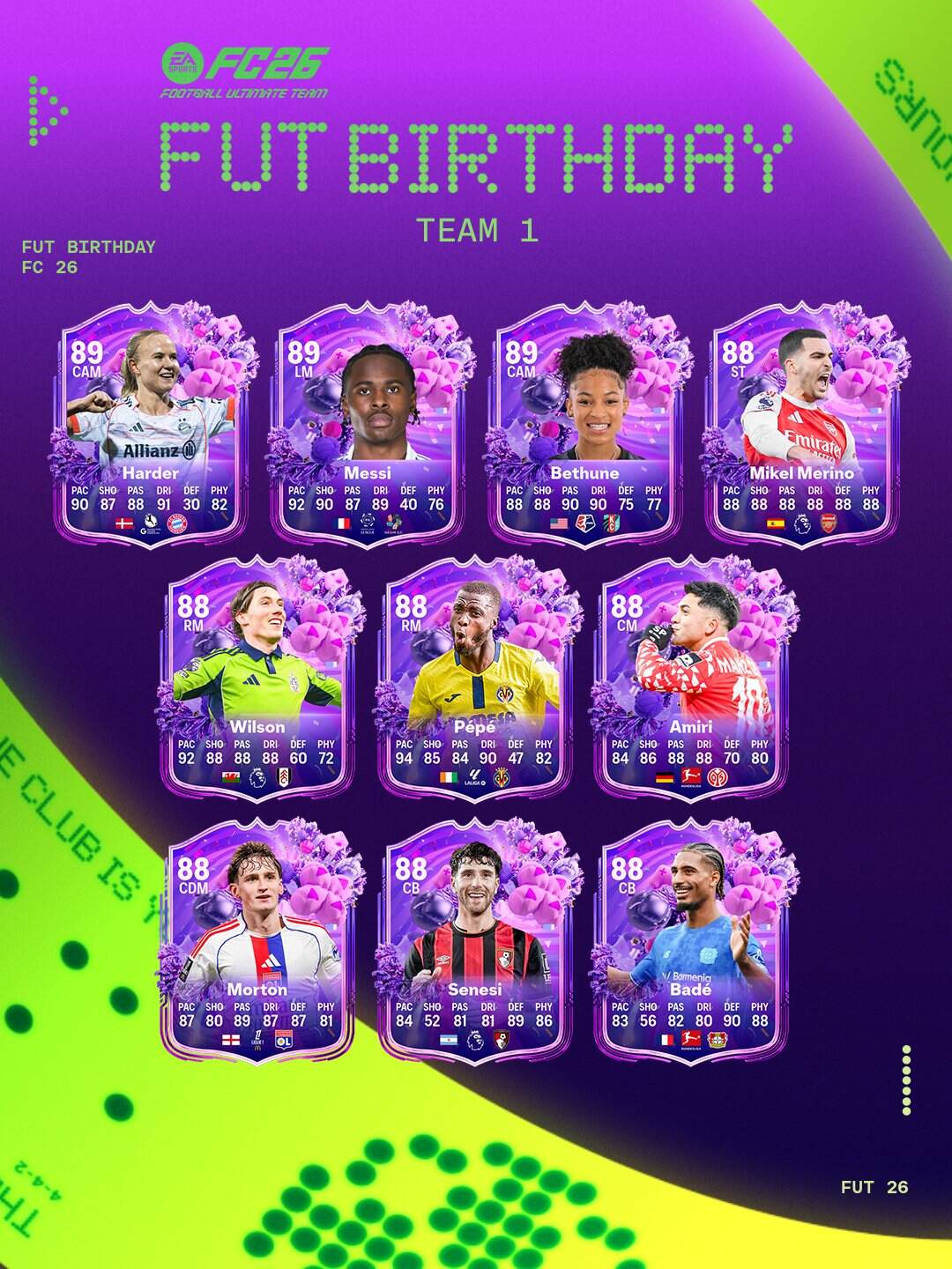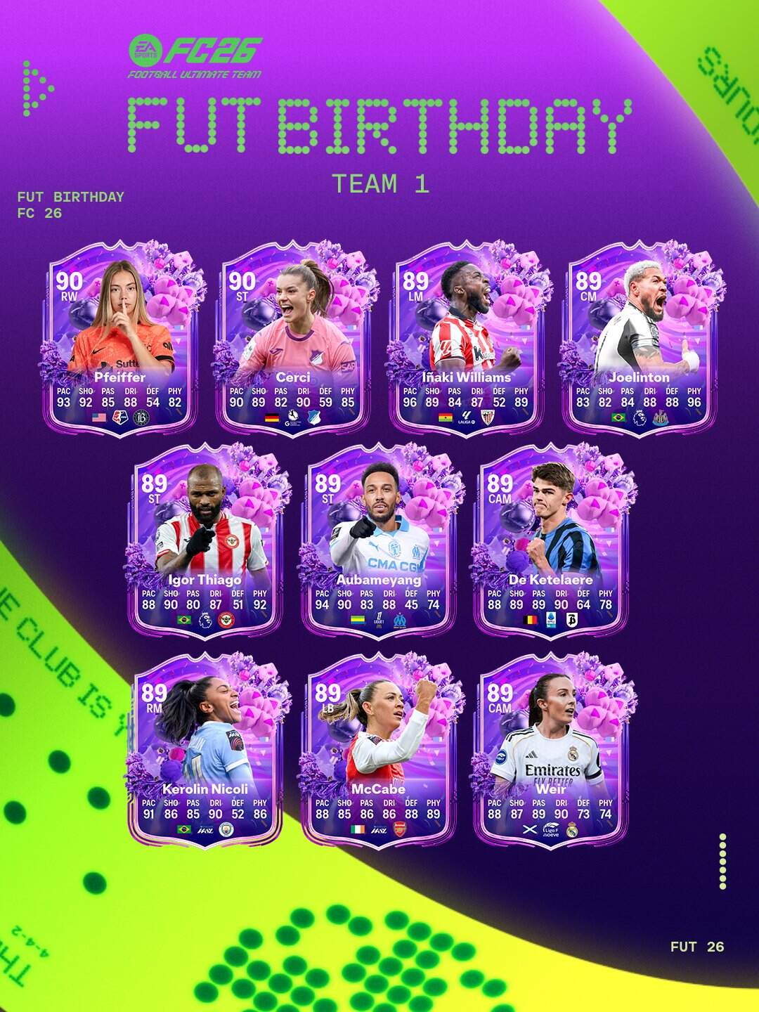 A partir del Viernes 6 de Marzo, EA FC celebra su cumpleaños N°17 llegando con un equipo completo de nuevas cartas de Fut Birthday, las cuales tienen mejoras en sus estadísticas y estrellas de habilidad y pierna mala, además de un gran diseño. Este primer equipo, además de sus SBC’s y sus objetivos, estará disponible en sobres desde el Viernes 6 de hasta el Viernes 13 de Marzo. Algunas de las mejores cartas son Yamal, Ronaldo y Saint-Maximin.