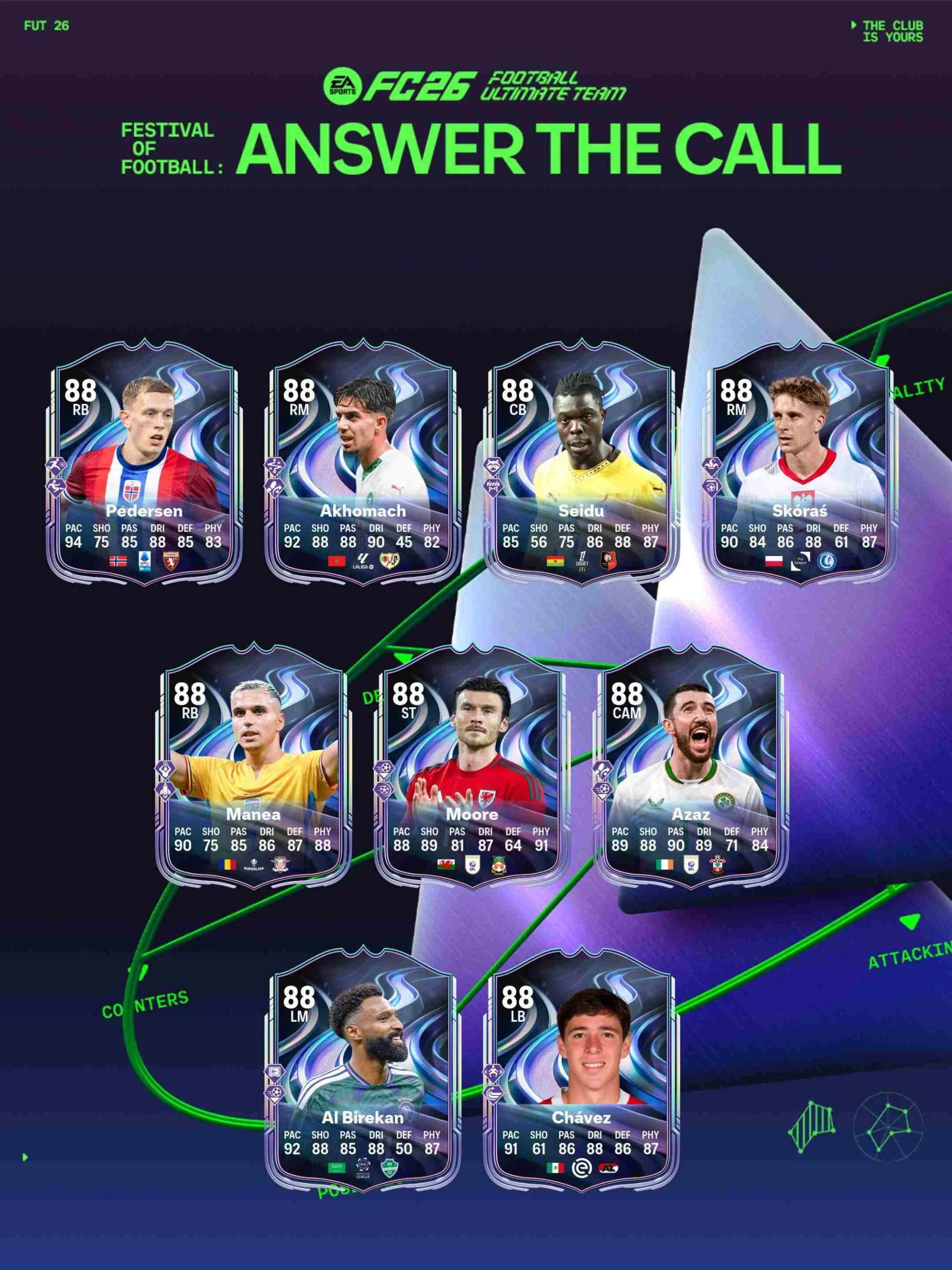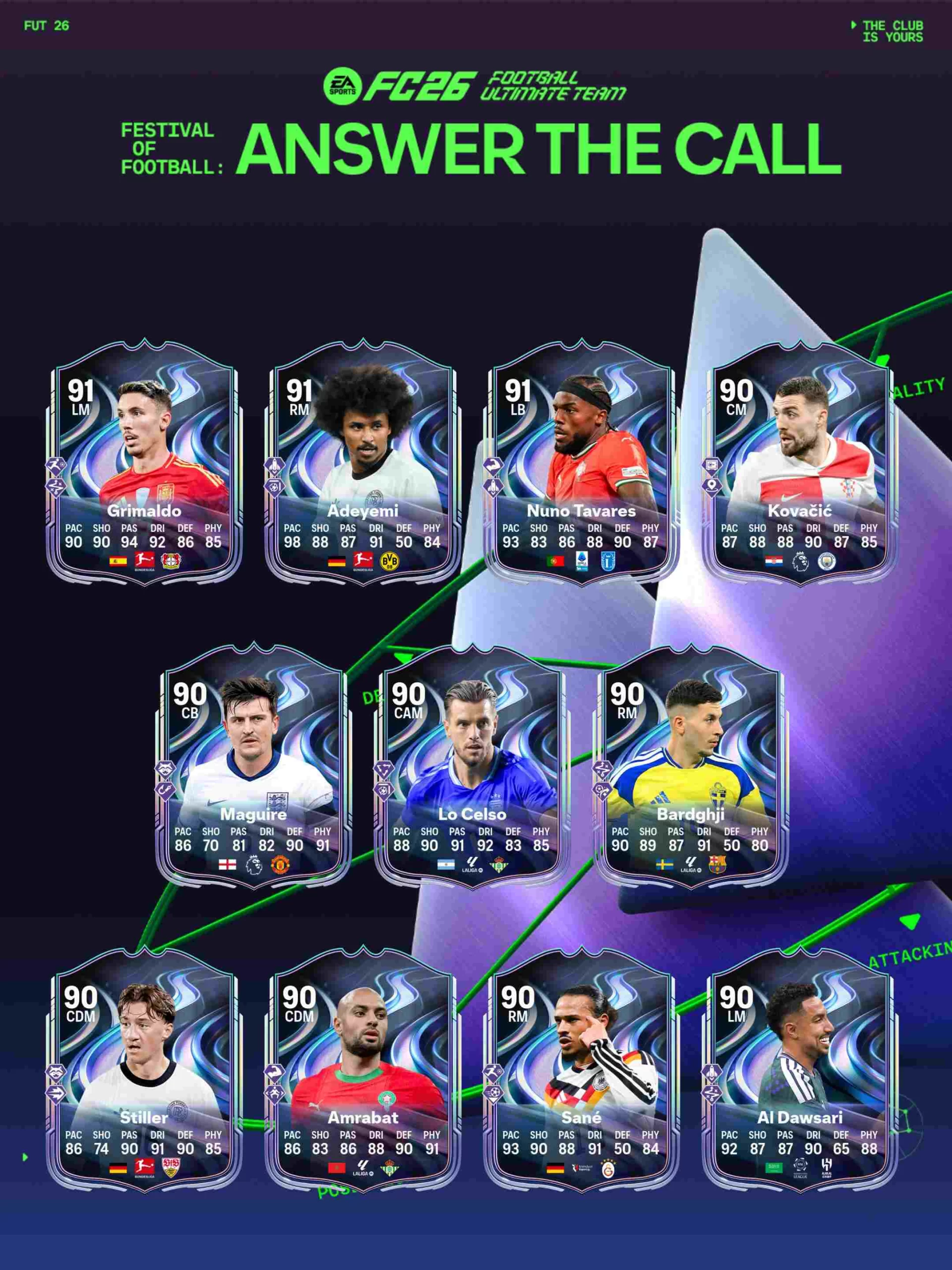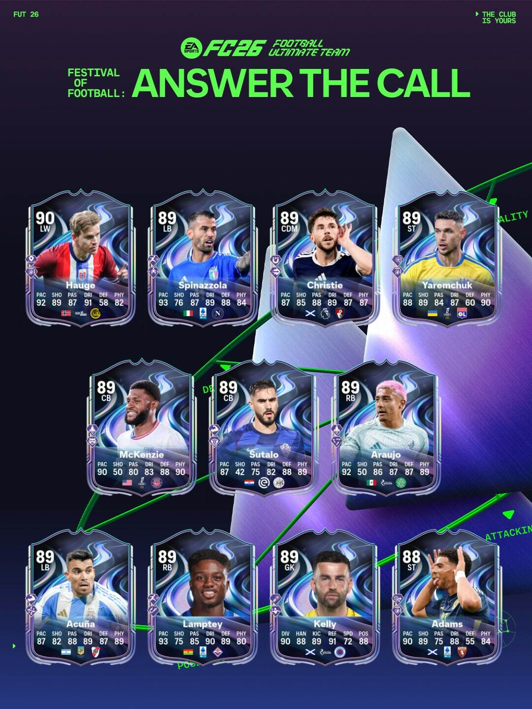 A partir del Viernes 20 de Marzo y disponibles en sobres, llega el equipo de Festival of Football: Answer The Call, el equipo que empieza la cuenta regresiva para el verano del futbol con el mundial llega a EA FC 26 con mejoras en la química y mejoras en vivo para los jugadores convocados por su selección nacional. Algunos de los mejores jugadores son Bellingham, Julián Álvarez y Joao Neves.