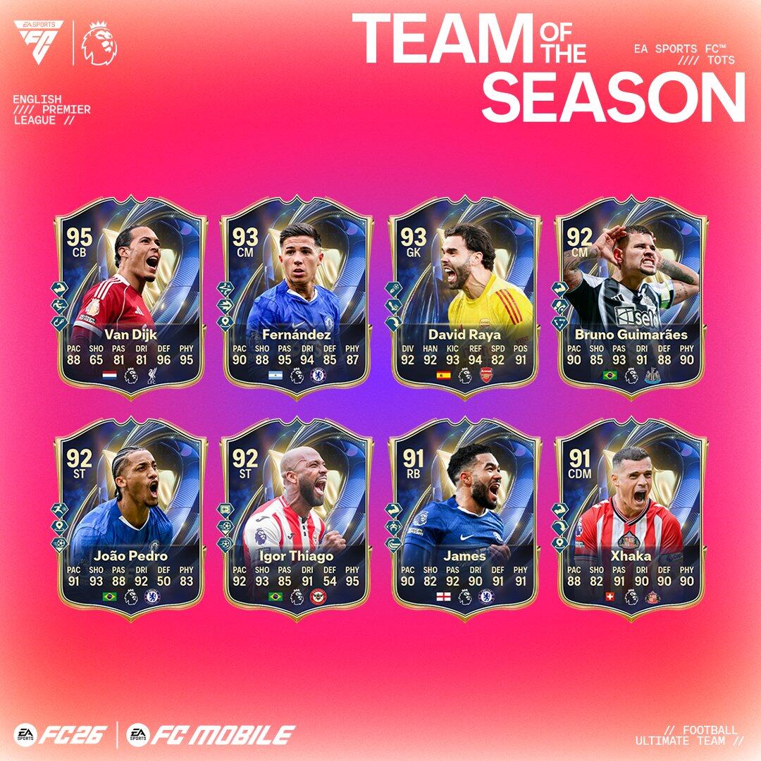 A partir del Viernes 24 de Abril y disponibles en sobres, el equipo de la temporada de la Premier league estará disponible en EA FC 26. Algunos de los mejores jugadores de los TOTS de la Premier League son Bruno Fernandes, Haaland y Rice.